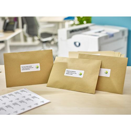 Újrahasznosított fehér szállítási címkék lézernyomtatáshoz. Vizes bázisú akril emulziós ragasztó. Lézernyomtatásra optimalizálva.