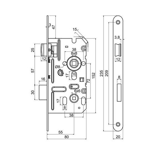 Bevéső zárak WC fogantyúhoz, 20mm, jobb