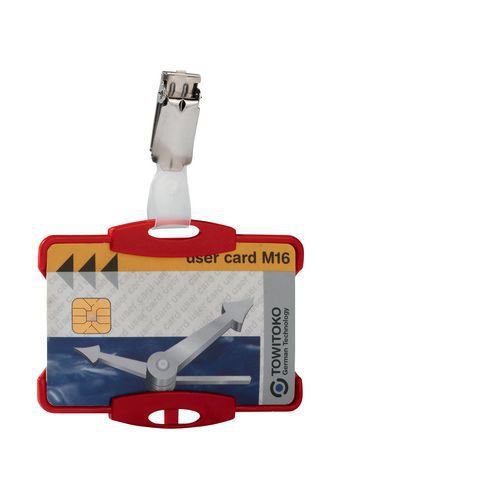 Kemény tok fém kapcsos mágneskártyához vagy biztonsági kártyához. A biztonsági információk közvetlenül a fedetlen oldalról olvashatók. A jelvénytartó kombinálható orsóval, zsinórral vagy lánccal. Két lyukkal rendelkezik, így vízszintesen is hordható vagy függőlegesen.