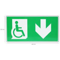 Vészkijárati jelölések mozgáskorlátozottak számára. Jó anyagállóság – korrózióálló alumínium. A polimer laminálás megvédi a táblákat a fizikai kopástól és kiszűri az UV-sugarakat. Kültéri vagy beltéri használatra.