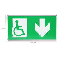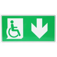 Vészkijárati jelölések mozgáskorlátozottak számára. Jó anyagállóság – korrózióálló alumínium. A polimer laminálás megvédi a táblákat a fizikai kopástól és kiszűri az UV-sugarakat. Kültéri vagy beltéri használatra.
