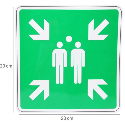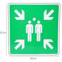 Biztonsági menekülési táblák, amelyek jelzik az emberek összegyűjtésének helyét evakuálás közben. A gyülekezőhely jobb megszervezést kínál az evakuáltak számára. Bármilyen sima, zsírtalanított és tiszta felülethez való ragaszkodás. A polimer laminálás megvédi a táblákat a fizikai kopástól és kiszűri az UV-sugarakat .