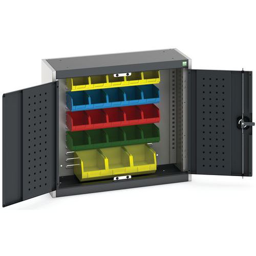 Függesztett fémszekrény perforációval és műanyag dobozkészlet szerszámok tárolására. A szekrény perforált hátlapja műanyag dobozok (lamellák) és perforált belső oldallal ellátott szekrényajtó akasztásához szerszámtartók elhelyezéséhez (perfo típus). Robustus hegesztett acél konstrukció 1 tonna teherbírásig, porszórt. Hengerzár két kulccsal. A 23 dobozos készlet 20 db-ot tartalmaz x műanyag doboz sz. 2 (Ma x Sz x Mé) 8,3 x 10,3 x 16,5 cm: 5 x sárga, 10 x piros, 5 x kék és műanyag doboz sz. 3 (Ma x Sz x Mé) 12,5 x 14,5 x 24 cm: 3 x sárga. A 33 dobozos készlet 28 x műanyag dobozt tartalmaz. 2 (Ma x Sz x Mé) 8,3 x 10,3 x 16,5 cm: 7 x sárga, 7 x piros, 14 x kék és műanyag doboz sz. 3 (Ma x SZ x Mé) 12,5 x 14,5 x 24 cm: 5 x sárga. A 43 dobozos készlet 28 x műanyag dobozt tartalmaz. 2 (Ma x Sz x Mé) 8,3 x 10,3 x 16,5 cm: 7 x sárga, 7 x piros, 14 x kék és 15 x műanyag doboz sz. 3 (MaxSzxM) 12,5 x 14,5 x 24 cm: 5 x sárga, 5 x piros, 5 x kék.