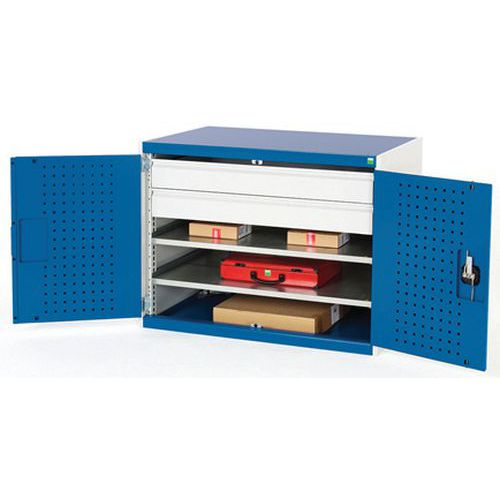 100 kg teherbírású polcokkal és fiókokkal felszerelt fém műhelyszekrények a hatékony üzemi és műhelyi használat érdekében. Magas hegesztett acélszerkezet, akár 1,5 tonna teherbírással, porszórt bevonattal. Megerősített szárnyas ajtók perforált belső oldallal szerszámok tárolására. . Hárompontos hengeres tengelytávzár két kulccsal. 25 mm-es lépésekben állítható magasságú horganyzott polcok. 75 kg-os teherbírású, görgős csapágyakon 100%-ban kihúzható fiókok.