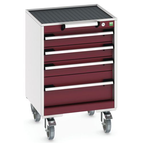Bott Cubio mobil fiókos szekrények 2 cm vastag felső munkafelülettel multiplex/linóleum típusú vagy hajtogatott lap szőnyeggel. Terhelhetőség 300 kg-ig, robusztus hegesztett acél szerkezet, porszórt bevonat. Központosan záródó fiókok 3 magassággal x 10 és 1 x 20 cm, teherbírás 50 kg és 100%-os kihúzás görgős csapágyakon. Ergonomikus fiókfogantyúk ráírható csíkkal, blokkoló rendszer több fiók egyidejű kinyitásához. Két fix és két forgó kerék fékkel 12,5 cm átmérőjű.