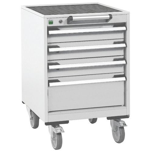 Bott Cubio mobil fiókos szekrények 2 cm vastag felső munkafelülettel multiplex/linóleum típusú vagy hajtogatott lap szőnyeggel. Terhelhetőség 300 kg-ig, robusztus hegesztett acél szerkezet, porszórt bevonat. Központosan záródó fiókok 3 magassággal x 10 és 1 x 20 cm, teherbírás 50 kg és 100%-os kihúzás görgős csapágyakon. Ergonomikus fiókfogantyúk ráírható csíkkal, blokkoló rendszer több fiók egyidejű kinyitásához. Két fix és két forgó kerék fékkel 12,5 cm átmérőjű. Max. terhelés (kg) : 300 kg