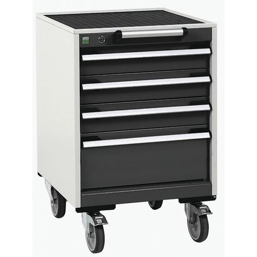 Bott Cubio mobil fiókos szekrények 2 cm vastag felső munkafelülettel multiplex/linóleum típusú vagy hajtogatott lap szőnyeggel. Terhelhetőség 300 kg-ig, robusztus hegesztett acél szerkezet, porszórt bevonat. Központosan záródó fiókok 3 magassággal x 10 és 1 x 20 cm, teherbírás 50 kg és 100%-os kihúzás görgős csapágyakon. Ergonomikus fiókfogantyúk ráírható csíkkal, blokkoló rendszer több fiók egyidejű kinyitásához. Két fix és két forgó kerék fékkel 12,5 cm átmérőjű. Max. terhelés (kg) : 300 kg
