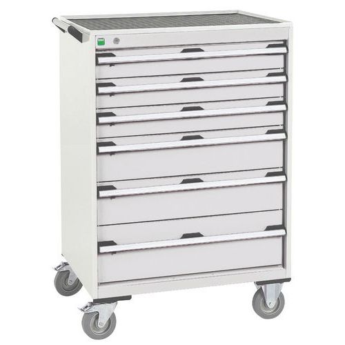 Bott Cubio mobil fiókos szekrények 2 cm vastag felső munkafelülettel, multiplex/linóleum típusú vagy hajtogatott lemezes szőnyeggel. Terhelhetőség 600 kg-ig, robusztus hegesztett acélszerkezet, porszórt bevonat. Központosan záródó fiókok magassággal 3 x 10, 2 x 15 és 1 x 20 cm, teherbírás 50 kg és 100%-os kihúzás görgős csapágyakon. Ergonómikus fiókfogantyúk ráírható csíkkal, blokkolórendszer több fiók egyidejű nyitásához. Két fix és két forgatható kerekek 12,5 cm átmérőjű fékkel. Max. terhelés (kg) : 600 kg