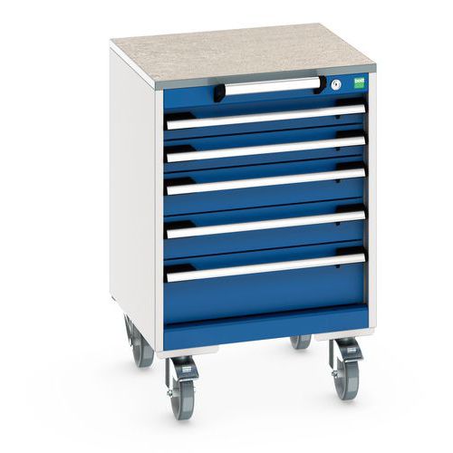 Bott Cubio mobil fiókos szekrények 2 cm vastag felső munkafelülettel multiplex/linóleum vagy hajtogatott lap szőnyeggel. Terhelhetőség 300 kg-ig, robusztus hegesztett acélszerkezet, porszórt bevonat. Központosan záródó fiókok 2 magassággal x 7,5 cm.