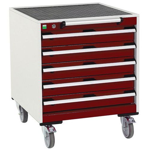 Bott Cubio mobil fiókos szekrények 2 cm vastag felső munkafelülettel, multiplex/linóleum típusú vagy hajtogatott lappal szőnyeggel. Terhelhetőség 300 kg-ig, robusztus hegesztett acélszerkezet, porszórt bevonat. Központosan záródó fiókok magassággal 5 x 10 cm, teherbírás 50 kg és 100%-os kihúzás görgős csapágyakon. Ergonomikus fiókfogantyúk ráírható csíkkal, blokkolórendszer több fiók egyidejű nyitásához. Két fix és két forgó kerék 12,5-ös fékkel cm átmérőjű.