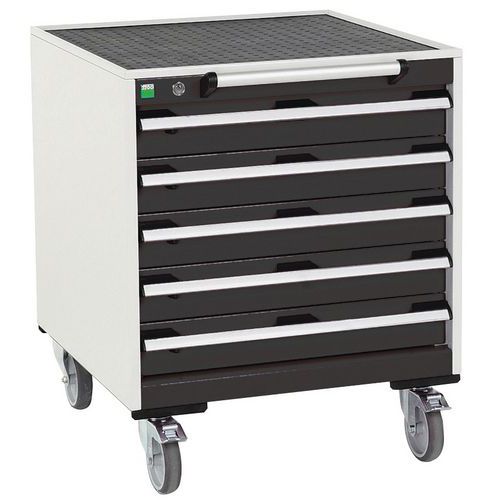 Bott Cubio mobil fiókos szekrények 2 cm vastag felső munkafelülettel, multiplex/linóleum típusú vagy hajtogatott lappal szőnyeggel. Terhelhetőség 300 kg-ig, robusztus hegesztett acélszerkezet, porszórt bevonat. Központosan záródó fiókok magassággal 5 x 10 cm, teherbírás 50 kg és 100%-os kihúzás görgős csapágyakon. Ergonomikus fiókfogantyúk ráírható csíkkal, blokkolórendszer több fiók egyidejű nyitásához. Két fix és két forgó kerék 12,5-ös fékkel cm átmérőjű.