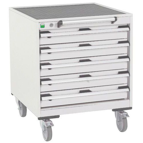 Bott Cubio mobil fiókos szekrények 2 cm vastag felső munkafelülettel, multiplex/linóleum típusú vagy hajtogatott lappal szőnyeggel. Terhelhetőség 300 kg-ig, robusztus hegesztett acélszerkezet, porszórt bevonat. Központosan záródó fiókok magassággal 5 x 10 cm, teherbírás 50 kg és 100%-os kihúzás görgős csapágyakon. Ergonomikus fiókfogantyúk ráírható csíkkal, blokkolórendszer több fiók egyidejű nyitásához. Két fix és két forgó kerék 12,5-ös fékkel cm átmérőjű.
