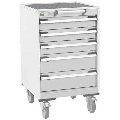 Bott Cubio mobil fiókos szekrények 2 cm vastag felső munkafelülettel, multiplex/linóleum típusú vagy hajtogatott lappal szőnyeggel. Terhelhetőség 300 kg-ig, robusztus hegesztett acélszerkezet, porszórt bevonat. Központosan záródó fiókok magassággal 3 x 10 és 2 x 15 cm, 50 kg-os teherbírással és 100%-os kihúzással gördülőcsapágyakon. Ergonómikus fiókfogantyúk, feliratozható címkével, blokkoló rendszer több fiók egyidejű nyitásához. Két fix és két forgó kerék 12,5 cm átmérőjű fékkel.