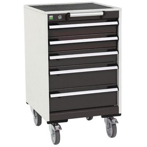 Bott Cubio mobil fiókos szekrények 2 cm vastag felső munkafelülettel, multiplex/linóleum típusú vagy hajtogatott lappal szőnyeggel. Terhelhetőség 300 kg-ig, robusztus hegesztett acélszerkezet, porszórt bevonat. Központosan záródó fiókok magassággal 3 x 10 és 2 x 15 cm, 50 kg-os teherbírással és 100%-os kihúzással gördülőcsapágyakon. Ergonómikus fiókfogantyúk, feliratozható címkével, blokkoló rendszer több fiók egyidejű nyitásához. Két fix és két forgó kerék 12,5 cm átmérőjű fékkel.