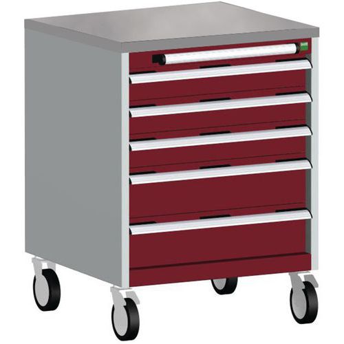 Bott Cubio mobil fiókos szekrények 2 cm vastag felső munkafelülettel, multiplex/linóleum típusú vagy hajtogatott lappal szőnyeggel. Terhelhetőség 300 kg-ig, robusztus hegesztett acélszerkezet, porszórt bevonat. Központosan záródó fiókok magassággal 3 x 10 és 2 x 15 cm, 50 kg-os teherbírással és 100%-os kihúzással gördülőcsapágyakon. Ergonómikus fiókfogantyúk, feliratozható címkével, blokkoló rendszer több fiók egyidejű nyitásához. Két fix és két forgó kerék 12,5 cm átmérőjű fékkel.