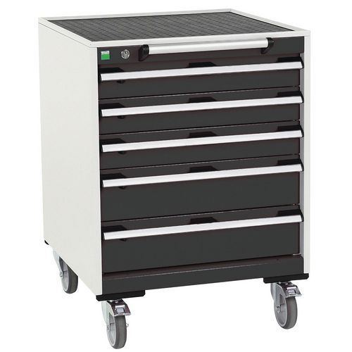 Bott Cubio mobil fiókos szekrények 2 cm vastag felső munkafelülettel, multiplex/linóleum típusú vagy hajtogatott lappal szőnyeggel. Terhelhetőség 300 kg-ig, robusztus hegesztett acélszerkezet, porszórt bevonat. Központosan záródó fiókok magassággal 3 x 10 és 2 x 15 cm, 50 kg-os teherbírással és 100%-os kihúzással gördülőcsapágyakon. Ergonómikus fiókfogantyúk, feliratozható címkével, blokkoló rendszer több fiók egyidejű nyitásához. Két fix és két forgó kerék 12,5 cm átmérőjű fékkel.