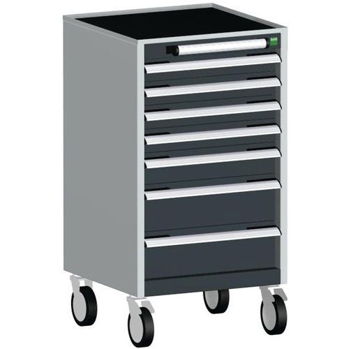 Bott Cubio mobil fiókos szekrények 2 cm vastag felső munkafelülettel, multiplex/linóleum típusú vagy hajtogatott lappal szőnyeggel. Terhelhetőség 300 kg-ig, robusztus hegesztett acélszerkezet, porszórt bevonat. Központosan záródó fiókok magassággal 4 x 7,5, 1 x 10 és 2 x 15 cm, 50 kg teherbírással és 100%-os kihúzással görgős csapágyakon. Ergonomikus fiókfogantyúk, ráírható címkével, több fiók nyitását blokkoló rendszer egyidejűleg. Két rögzített és két forgatható kerék 12,5 cm átmérőjű fékkel . Max. terhelés (kg) : 300 kg