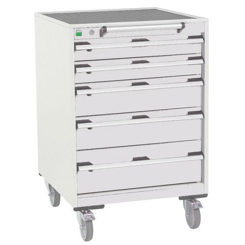 Bott Cubio mobil fiókos szekrények 2 cm vastag felső munkafelülettel multiplex/linóleum vagy hajtogatott lap szőnyeggel. Terhelhetőség 300 kg-ig, robusztus hegesztett acélszerkezet, porszórt bevonat. Központosan záródó fiókok 2 magassággal x 10, 2 x 15 és 1 x 20 cm, teherbírás 50 kg és 100%-os kihúzás görgős csapágyakon. Ergonomikus fiókfogantyúk ráírható csíkkal, blokkolórendszer több fiók egyidejű nyitásához. Két fix és két forgó kerék 12,5 cm átmérőjű fékkel. Max. terhelés (kg) : 300 kg