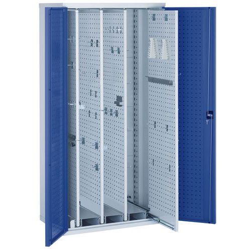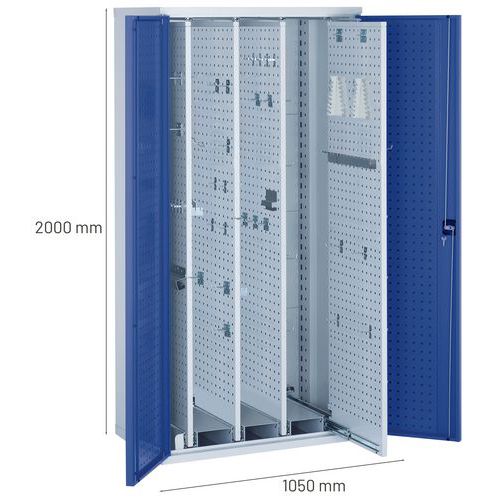 Műhelyszekrények négy kihúzható kétoldalas perforált panellel, teljes toldattal a szerszámok rugalmas felakasztásához. Elegendő 20,1 cm-es távolsággal rendelkező panelek a szerszámok felakasztására és több panel egyidejű meghosszabbítását blokkoló rendszerrel Szerszámtartók elhelyezésére tervezett panelek (perfo típusú) vagy műanyag dobozok felfüggesztésére (zsalu típus). Hegesztett acélszerkezet, porszórt felületkezelés. Megerősített szárnyas ajtó hárompontos hengerzárral, két kulccsal.