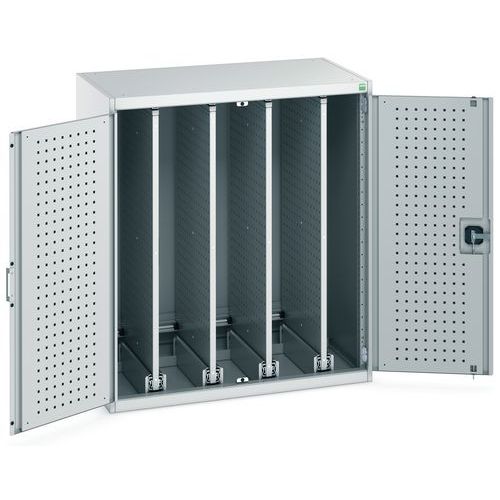 Műhelyszekrények négy kihúzható kétoldalas perforált panellel, teljes toldattal a szerszámok rugalmas felakasztásához. Elegendő 20,1 cm-es távolsággal rendelkező panelek a szerszámok felakasztására és több panel egyidejű meghosszabbítását blokkoló rendszerrel Szerszámtartók elhelyezésére tervezett panelek (perfo típusú) vagy műanyag dobozok felfüggesztésére (zsalu típus). Hegesztett acélszerkezet, porszórt felületkezelés. Megerősített szárnyas ajtó hárompontos hengerzárral, két kulccsal.