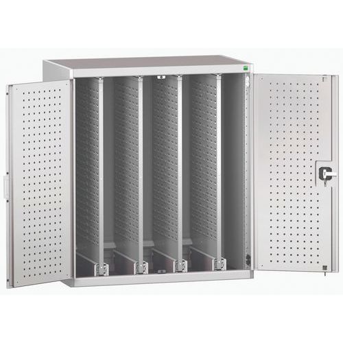 Műhelyszekrények négy kihúzható kétoldalas perforált panellel, teljes toldattal a szerszámok rugalmas felakasztásához. Elegendő 20,1 cm-es távolsággal rendelkező panelek a szerszámok felakasztására és több panel egyidejű meghosszabbítását blokkoló rendszerrel Szerszámtartók elhelyezésére tervezett panelek (perfo típusú) vagy műanyag dobozok felfüggesztésére (zsalu típus). Hegesztett acélszerkezet, porszórt felületkezelés. Megerősített szárnyas ajtó hárompontos hengerzárral, két kulccsal.