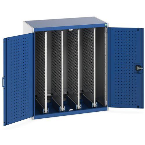 Műhelyszekrények négy kihúzható kétoldalas perforált panellel, teljes toldattal a szerszámok rugalmas felakasztásához. Elegendő 20,1 cm-es távolsággal rendelkező panelek a szerszámok felakasztására és több panel egyidejű meghosszabbítását blokkoló rendszerrel Szerszámtartók elhelyezésére tervezett panelek (perfo típusú) vagy műanyag dobozok felfüggesztésére (zsalu típus). Hegesztett acélszerkezet, porszórt felületkezelés. Megerősített szárnyas ajtó hárompontos hengerzárral, két kulccsal. Max. terhelés (kg) : 1500 kg
