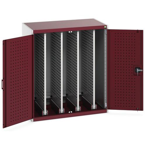 Műhelyszekrények négy kihúzható kétoldalas perforált panellel, teljes toldattal a szerszámok rugalmas felakasztásához. Elegendő 20,1 cm-es távolsággal rendelkező panelek a szerszámok felakasztására és több panel egyidejű meghosszabbítását blokkoló rendszerrel Szerszámtartók elhelyezésére tervezett panelek (perfo típusú) vagy műanyag dobozok felfüggesztésére (zsalu típus). Hegesztett acélszerkezet, porszórt felületkezelés. Megerősített szárnyas ajtó hárompontos hengerzárral, két kulccsal.