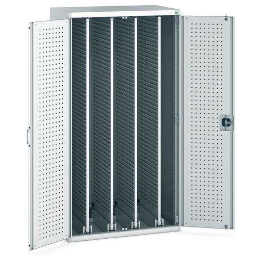 Műhelyszekrények négy kihúzható kétoldalas perforált panellel, teljes toldattal a szerszámok rugalmas felakasztásához. Elegendő 20,1 cm-es távolsággal rendelkező panelek a szerszámok felakasztására és több panel egyidejű meghosszabbítását blokkoló rendszerrel Szerszámtartók elhelyezésére tervezett panelek (perfo típusú) vagy műanyag dobozok felfüggesztésére (zsalu típus). Hegesztett acélszerkezet, porszórt felületkezelés. Megerősített szárnyas ajtó hárompontos hengerzárral, két kulccsal. Max. terhelés (kg) : 1500 kg