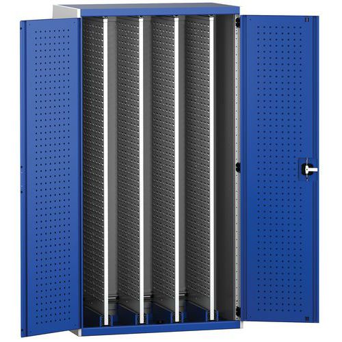 Műhelyszekrények négy kihúzható kétoldalas perforált panellel, teljes toldattal a szerszámok rugalmas felakasztásához. Elegendő 20,1 cm-es távolsággal rendelkező panelek a szerszámok felakasztására és több panel egyidejű meghosszabbítását blokkoló rendszerrel Szerszámtartók elhelyezésére tervezett panelek (perfo típusú) vagy műanyag dobozok felfüggesztésére (zsalu típus). Hegesztett acélszerkezet, porszórt felületkezelés. Megerősített szárnyas ajtó hárompontos hengerzárral, két kulccsal.