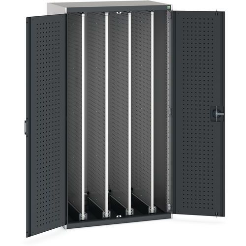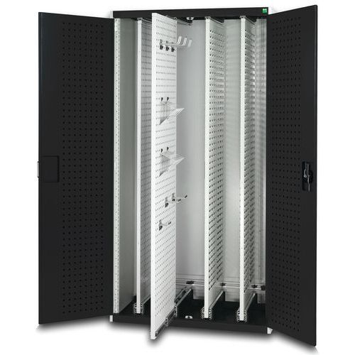 Műhelyszekrények négy kihúzható kétoldalas perforált panellel, teljes toldattal a szerszámok rugalmas felakasztásához. Elegendő 20,1 cm-es távolsággal rendelkező panelek a szerszámok felakasztására és több panel egyidejű meghosszabbítását blokkoló rendszerrel Szerszámtartók elhelyezésére tervezett panelek (perfo típusú) vagy műanyag dobozok felfüggesztésére (zsalu típus). Hegesztett acélszerkezet, porszórt felületkezelés. Megerősített szárnyas ajtó hárompontos hengerzárral, két kulccsal. Max. terhelés (kg) : 1500 kg