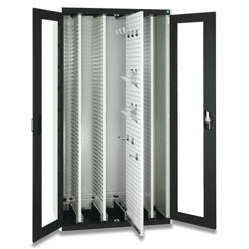 Bott Cubio műhelyszekrények visszahúzható perforált panelekkel, átlátszó ajtókkal