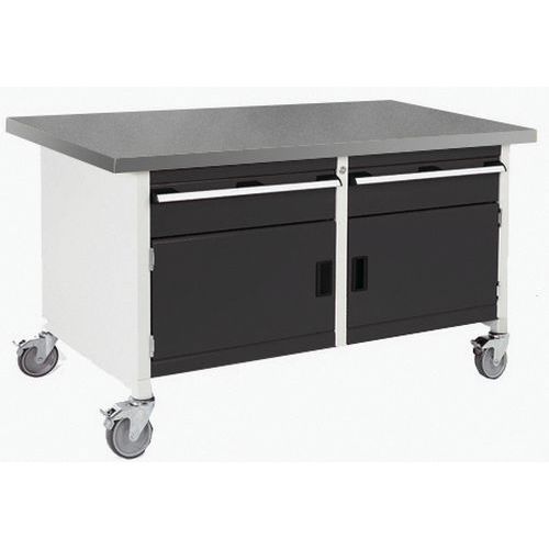 Cubio Storage mobil műhelyasztalok munkalappal tl. 4 cm-es típusú multiplex vagy linóleum. Terhelhetőség 300 kg-ig, robusztus hegesztett acélszerkezet, porszórt felületkezelés. Központosan zárható fiókok 2 x 15 cm-es magassággal, 75 kg-os teherbírással és 100%-os kihúzással a görgőn csapágyak. Zárható szekrény 35 cm-es ajtómagassággal, belsejében horganyzott, állítható magasságú polc 100 kg teherbírással. Két fix és két forgatható kerék 12,5 cm átmérőjű fékkel.