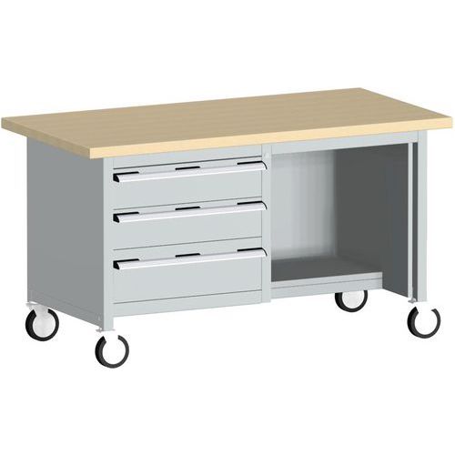 Bott Cubio Storage mobil műhelyasztal, 84 x 150 x 75 cm, 3 fiók, polcok, multiplex/linóleum