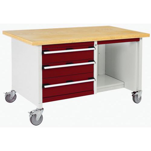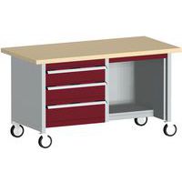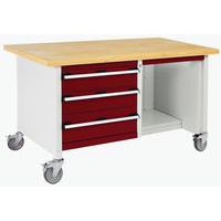 Mobil műhelyasztal Bott Cubio Tároló, 84 x 150 x 75 cm, 3 fiók, polcok, multiplex, szürke-piros