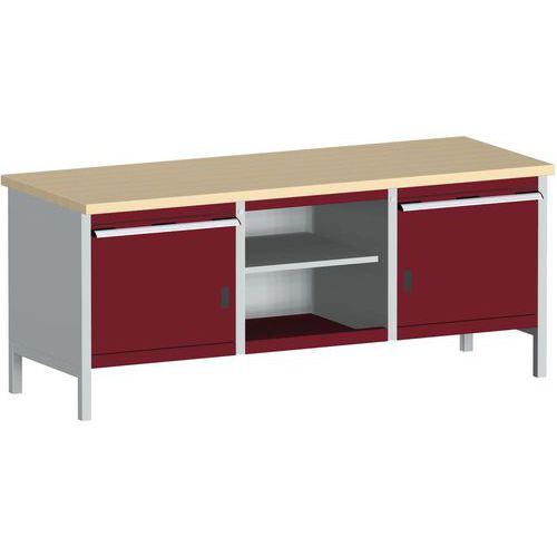 Bott Cubio Storage műhelyasztalok 4 cm vastag, multiplex vagy linóleum típusú munkalappal. Terhelhetőség 800 kg-ig, robusztus hegesztett acélszerkezet, porszórt bevonat. Központi zárású fiókok 2 x 15 magassággal, terhelhetőség 75 kg és 100% hosszabbítás gördülőcsapágyakon. Szekrényzárak 35 cm ajtómagassággal, belsejében horganyzott, állítható magasságú polc 100 kg teherbírással.