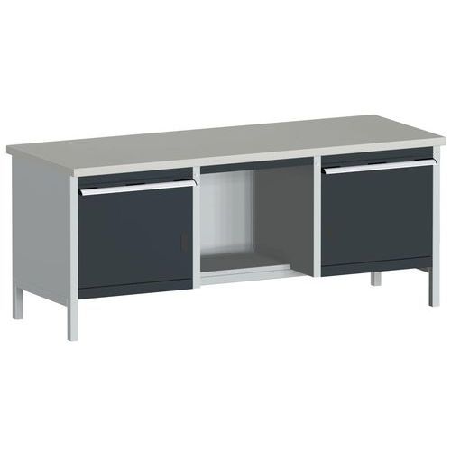 Bott Cubio Storage műhelyasztalok 4 cm vastag, multiplex vagy linóleum típusú munkalappal. Terhelhetőség 800 kg-ig, robusztus hegesztett acélszerkezet, porszórt bevonat. Központi zárású fiókok 2 x 15 magassággal, terhelhetőség 75 kg és 100% hosszabbítás gördülőcsapágyakon. Szekrényzárak 35 cm ajtómagassággal, belsejében horganyzott, állítható magasságú polc 100 kg teherbírással.