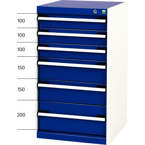 Kiváló minőségű robusztus szekrény fiókokkal. Teljesen kihúzható, jó hozzáférést nyújtó fiókok. A fiókok automatikus zárral rendelkeznek, és a biztonsági zár megakadályozza a véletlenszerű kinyílást. A fiókok fogantyúira címkék rögzíthetők. Központizáras fiókok. Max. terhelés (kg) : 1500 kg Max. polcterhelés (kg) : 75 kg