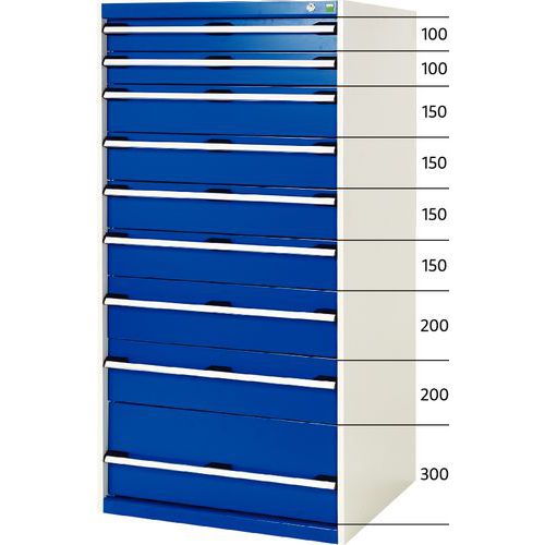 Fiókos műhelyszekrény szerszámok, műszerek és anyagok munkahelyi tárolására. Robusztus acéllemez-szerkezet porszórt felületkezeléssel. Teleszkópos síneken 100%-ig kihúzható fiókok. Fiókcímke elhelyezésére alkalmas fogantyúkkal, központi fiókzárral. Max. terhelés (kg) : 1500 kg