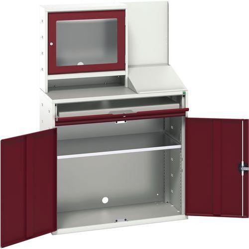 Számítógépes szekrény alkalmas PC-eszközök biztonságos munkahelyi tárolására és használatára. Hegesztett acélszerkezet, porszórt felületkezelés. A munkát megkönnyíti a ferde íróasztal és a hátsó mágneses panel. Külön zárható rekesz a monitornak, szellőzővel ablak. Zárható alsó szekrény kábelhüvelyekkel. Zárható fiók billentyűzet és egér számára. 1 állítható magasságú horganyzott polc. Max. terhelés (kg) : 1000 kg Max. polcterhelés (kg) : 75 kg