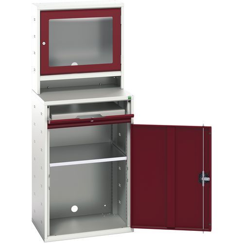 Számítógépes szekrény, amely alkalmas PC-eszközök biztonságos munkahelyi tárolására és használatára. Hegesztett acélszerkezet, porszórt felületkezelés. Külön zárható szellőző rekesz a monitorhoz kilátó ablakkal. Zárható alsó szekrény kábelhüvelyekkel. Zárható fiók billentyűzet és egér. 1 állítható magasságú horganyzott polc.