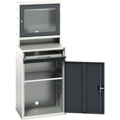 Számítógépes szekrény, amely alkalmas PC-eszközök biztonságos munkahelyi tárolására és használatára. Hegesztett acélszerkezet, porszórt felületkezelés. Külön zárható szellőző rekesz a monitorhoz kilátó ablakkal. Zárható alsó szekrény kábelhüvelyekkel. Zárható fiók billentyűzet és egér. 1 állítható magasságú horganyzott polc.
