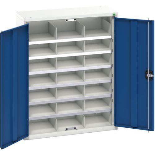 Fém műhelyszekrények rekeszekkel a műhelyanyag átlátszó tárolására. Rekeszek méretekkel HxSzxMé: 10 x 23,5 x 31 cm. Hegesztett acélszerkezettel, porszórt bevonattal. Horganyzott polcok 75 kg teherbírással. Megerősített szárnyas ajtók hengerzár két kulccsal.