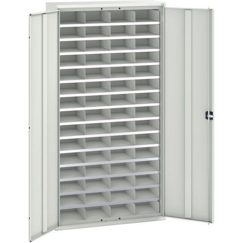 Fém műhelyszekrények rekeszekkel a műhelyanyag átlátszó tárolására. Rekeszek méretekkel HxSzxMé: 10 x 23,5 x 31 cm. Hegesztett acélszerkezettel, porszórt bevonattal. Horganyzott polcok 75 kg teherbírással. Megerősített szárnyas ajtók hengerzár két kulccsal. Max. terhelés (kg) : 1000 kg Max. polcterhelés (kg) : 75 kg