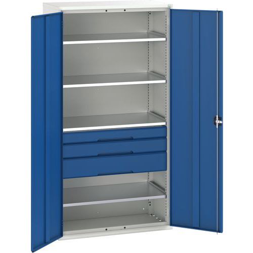 Fiókos műhelyszekrény Bott Verso, 200 x 105 x 55 cm, 4 polc, 3 fiók, szürke-kék Fiókos műhelyszekrény Bott Verso, 200 x 105 x 55 cm, 4 polc, 3 fiók, szürke-kék
