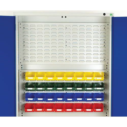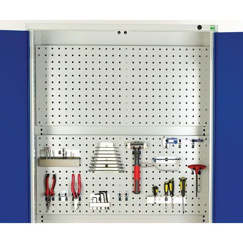 Fém műhelyszekrények hatékony használathoz üzemben és műhelyben. Hegesztett acélszerkezet, porszórt felületkezelés. Megerősített lengőajtók hárompontos hengerzárral, két kulccsal. Horganyzott polcok és fiókok 75 kg teherbírással, fiókok 100%-os meghosszabbítás a gördülőcsapágyakon. A hátsó fal perforált a szerszámtartók elhelyezéséhez és a műanyag dobozok felakasztásához. Max. terhelés (kg) : 1000 kg Max. polcterhelés (kg) : 75 kg