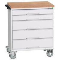 Mobil munkaasztal Bott Verso fiókokkal 3 cm vastag felső munkafelülettel, multiplex/linóleum típusú vagy hajtogatott fémlemez szőnyeggel. Terhelhetőség 200 kg-ig, robusztus hegesztett acélszerkezet, porszórt felület. Központosan záródó fiókok magassággal 2 x 10, 3 x 17,5 cm-es, 50 kg-os teherbírással és 100%-os kihúzással gördülőcsapágyakon. Ergonomikus fiókfogantyúk ráírható csíkkal, több fiók egyidejű nyitását blokkoló rendszer. Két fix és két forgó kerék 12,5 cm átmérőjű fékkel, kezelhető fogantyúk könnyítik meg. A multiplex és linóleum munkalapok átfedése a normál 55 cm-ről 60 cm-re szélesíti a kocsit, ugyanakkor 96,5-ről 98 cm-re növeli a magasságot.