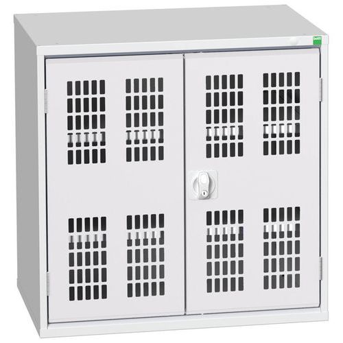 Fém műhelyszekrények drótajtókkal a jó szellőzés és a tartalom átláthatósága érdekében. A 75 kg teherbírású horganyzott polcok magassága 25 mm-es lépésekben állítható. Hegesztett acélszerkezet, porszórt felületkezelés. Hárompontos zárás hengereltolásos zár.