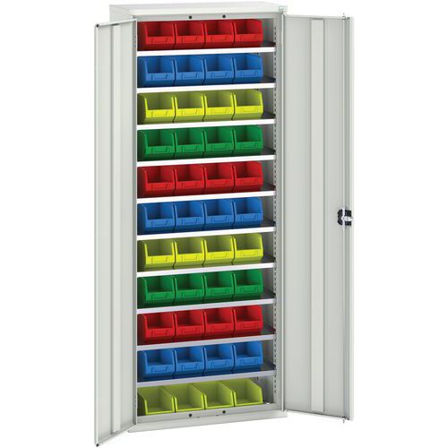Műanyag dobozokkal felszerelt fém műhelyszekrények kisebb anyagokhoz. Hegesztett acélszerkezet, porszórt felületkezelés. Horganyzott polcok 75 kg teherbírással, 25 mm-es lépésekben állítható magassággal. Megerősített lengőajtók hárompontos hengerzárral két kulccsal. Műanyag dobozokkal együtt szállítva. No. 3 HxSzxM: 12,5 x 14,5 x 24 cm (színkeverék). Max. terhelés (kg) : 1000 kg Max. polcterhelés (kg) : 75 kg