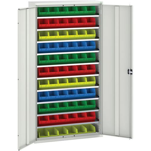 Műanyag dobozokkal felszerelt fém műhelyszekrények kisebb anyagokhoz. Hegesztett acélszerkezet, porszórt felületkezelés. Horganyzott polcok 75 kg teherbírással, 25 mm-es lépésekben állítható magassággal. Megerősített lengőajtók hárompontos hengerzárral két kulccsal. Műanyag dobozokkal együtt szállítva. No. 3 HxSzxM: 12,5 x 14,5 x 24 cm (színkeverék). Max. terhelés (kg) : 1000 kg Max. polcterhelés (kg) : 75 kg
