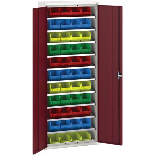 Műanyag dobozokkal felszerelt fém műhelyszekrények kisebb anyagokhoz. Hegesztett acélszerkezet, porszórt felületkezelés. Horganyzott polcok 75 kg teherbírással, 25 mm-es lépésekben állítható magassággal. Megerősített lengőajtók hárompontos hengerzárral két kulccsal. Műanyag dobozokkal együtt szállítva. No. 3 HxSzxM: 12,5 x 14,5 x 24 cm (színkeverék). Max. polcterhelés (kg) : 75 kg Max. terhelés (kg) : 1000 kg